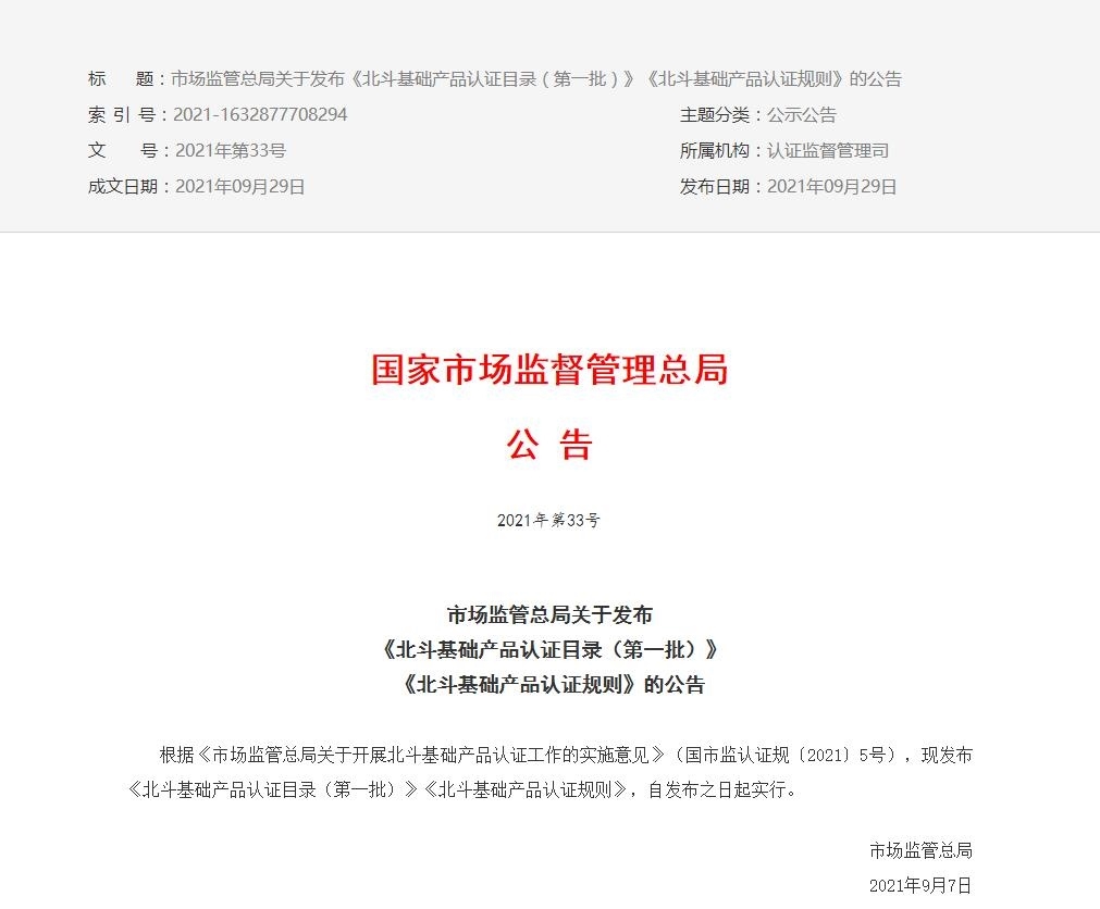 近日,國(guó)家市場(chǎng)監(jiān)督管理總局發(fā)布關(guān)于《北斗基礎(chǔ)產(chǎn)品認(rèn)證目錄(第一批)》、《北斗基礎(chǔ)產(chǎn)品認(rèn)證規(guī)則》公告,自發(fā)布之日起實(shí)行。