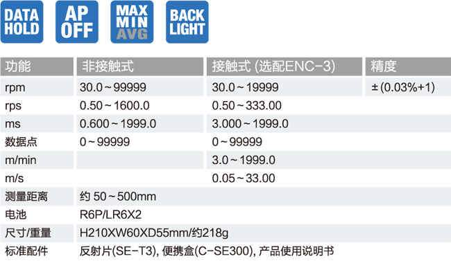 日本三和(sanwa)SE300轉(zhuǎn)速計(jì),外殼獨(dú)特的流線型設(shè)計(jì),使用極為方便,是測(cè)量馬達(dá)等旋轉(zhuǎn)體的轉(zhuǎn)動(dòng)圈數(shù)的非接觸式和接觸式兩用型手持轉(zhuǎn)速計(jì)。
