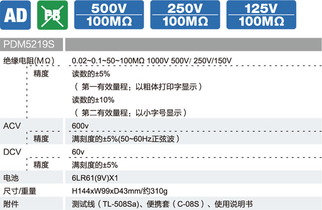 ■ 三個(gè)測(cè)試量程,測(cè)試電壓DC125V/250V/500V