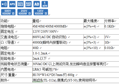 日本三和(sanwa)MG500絕緣電阻測試儀,精良的設計,超值的手感,讓您更安全地測量絕緣電阻。廣泛用于測量發(fā)電機、馬達、電源變壓器、配線、電器和其它電氣裝置的絕緣電阻。顯示數值4000字的大屏幕液晶顯示屏,數字和模擬條雙顯示,LED背光,即使在光線較弱的位置也能有效讀數,增強了可讀性。