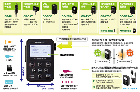 GL100-WL無線溫度記錄儀是日本圖技生產(chǎn)的便攜式溫濕度記錄儀,便攜式溫濕度記錄儀GL100-WL無線溫度記錄儀,可以同時(shí)記錄溫度和濕度。便攜式溫濕度記錄儀GL100-WL無線溫度記錄儀可以同時(shí)顯示溫度、濕度、露點(diǎn)溫度。便攜式溫濕度記錄儀GL100-WL無線溫度記錄儀內(nèi)置4.9M存儲空間,還可以外接擴(kuò)展卡,保證更多的數(shù)據(jù)存儲空間。便攜式溫濕度記錄儀GL100-WL無線溫度記錄儀配有usb接口方便數(shù)據(jù)傳輸和下載。便攜式溫濕度記錄儀GL100-WL無線溫度記錄儀還可以選配多種選件來實(shí)現(xiàn)電壓、電流、照度、紫外強(qiáng)度、二氧化碳等參數(shù)的測量。