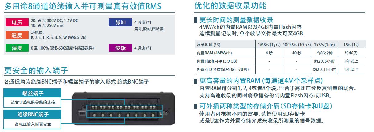 | 中繼收錄 | 當(dāng)4GB的收錄文件滿時, 會生成新的收錄文件繼續(xù)記錄數(shù)據(jù), 直到收錄停止 收錄地址: 內(nèi)置Flash閃存, SD存儲卡, U盤 最快采樣間隔: 最快1ms (CSV格式收錄時10ms) | ||