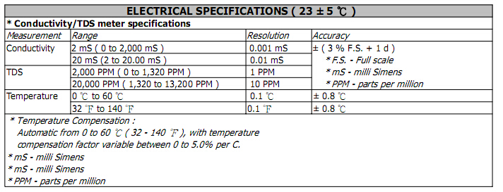 *電導(dǎo)率儀包括兩個(gè)范圍:: 2 mS, 20 mS. TDS 2,000 PPM, 20,000 PPM。溫度測(cè)量范圍為0 - 60 / 32 - 140℃℉