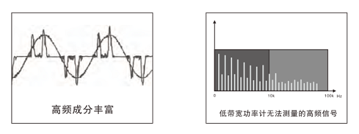 在測量正弦波時,如測試開關(guān)電源、變頻家電等輸入波形中含有豐富高頻諧波成分時,功率計的測量頻率范圍及帶寬不夠的情況下,無法測試其高頻諧波分量, PF2010能夠保證在測試這類產(chǎn)品時,準確測量功率及功率因素。