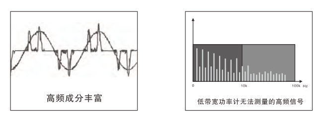 在測(cè)量正弦波時(shí),如測(cè)試開(kāi)關(guān)電源、變頻家電等輸入波形中含有豐富高頻諧波成分時(shí),功率計(jì)的測(cè)量頻率范圍及帶寬不夠的情況下,無(wú)法測(cè)試其高頻諧波分量, PF330A系列能夠保證在測(cè)試這類產(chǎn)品時(shí),準(zhǔn)確測(cè)量功率及功率因素。