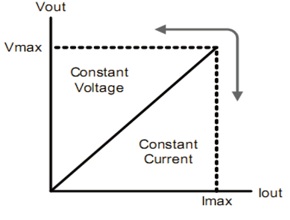 通過此功能,電源可在隨負(fù)載變化而發(fā)生的恒定電壓模式到恒定電流模式的轉(zhuǎn)換時(shí)保持不間斷操作。針對(duì)當(dāng)前的負(fù)載,電源工作在恒電壓模式下,電源將提供一個(gè)受控制的輸出電壓,隨著負(fù)載電阻值的變小,輸出電壓降保持恒定,直到電流增大而受限于預(yù)設(shè)的電流值,然后發(fā)生轉(zhuǎn)換。此時(shí)電源變?yōu)槎娏鬏敵觯敵鲭妷簩⒏鶕?jù)進(jìn)一步的負(fù)載電阻值變小按比例降低。當(dāng)電流值低于設(shè)定值時(shí),電源返回恒電壓模式。