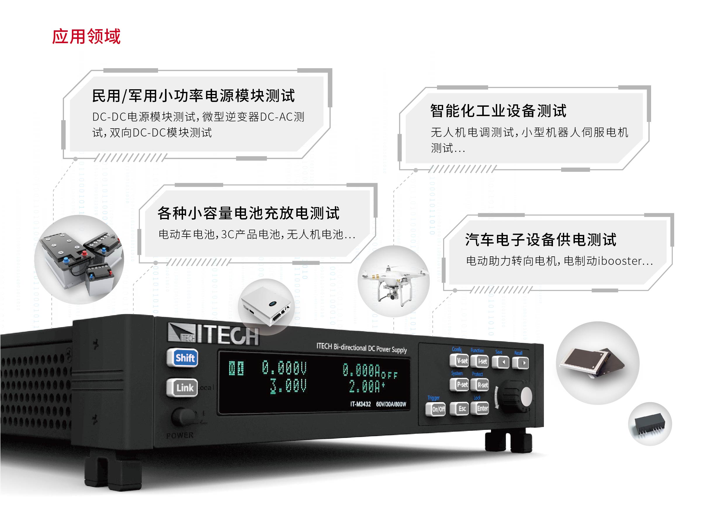 IT-M3400 雙向可編程直流電源集雙向電源和回饋式負載功能特性于一體,延續(xù)了M系列的高功率密度和模組式架構設計,可以滿足客戶的不同電流功率的測試需求。獨立的多通道設計,用戶可依據(jù)待測物的測試需求數(shù)量與規(guī)格任意配置每一個通道,滿足客制化需求。同時具備高精度的輸出和量測,并且針對測試做了多項安全設計,適合用于電源模塊、智能化工業(yè)設備、汽車電子和各種小容量電池充放電測試等多個測試領域。