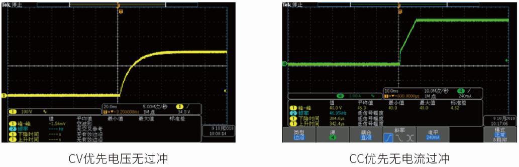 允許用自行設(shè)定電源ON時的輸出模式,防止電源輸出ON時的過沖。選擇CV優(yōu)先模式,電源優(yōu)先高速建立電壓的同時抑制電壓過沖的產(chǎn)生。選擇CC優(yōu)先模式,電源優(yōu)先高速建立電流的同時抑制電流過沖的產(chǎn)生。