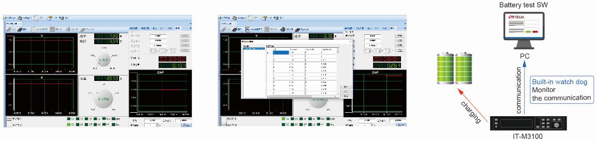 IT-M3100系列具有電池充電功能,可對電池進行充電測試。用戶通過面板就可自行設(shè)置電池四種測試關(guān)斷條件:關(guān)斷電壓、關(guān)斷電流、關(guān)斷容量和充電時間。當(dāng)四者中任意一種條件滿足時,即會自動中斷測試。測試過程中可觀測電池的電壓、充電時間和已充電容量。同時,IT9000上位機軟件配置看門狗功能,為用戶提供可靠的自動化測試方案。