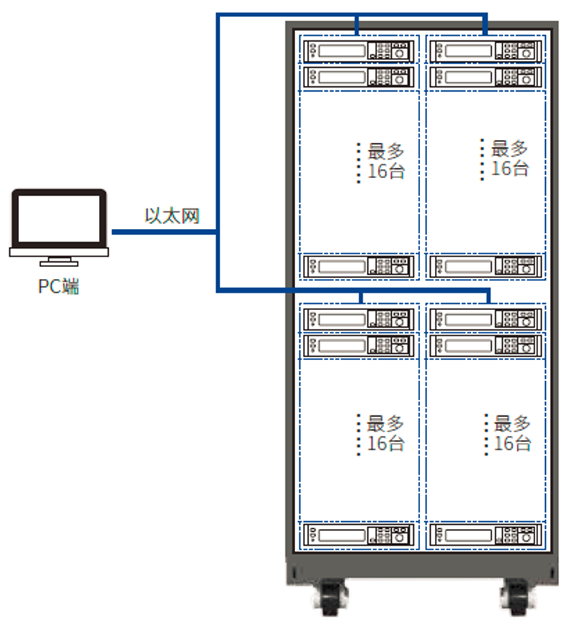 IT-M3100系列具備獨立多通道的設(shè)計架構(gòu), 16臺IT-M3100組成多通道電源系統(tǒng)后,每臺儀器界面會顯示通道號。將其中一臺電源的通訊接口與PC 端連接,可在上位機軟件中獨立控制系統(tǒng)中的每臺電源,每個通道可完全獨立操作。IT-M3100系列可達16*16通道,1個37U機柜內(nèi)就可達64通道,透過并聯(lián)功能可支持多種不同功率的待測物測試,并且使用戶的使用更為彈性,設(shè)備的使用率大幅提高。