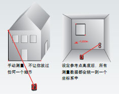 高度標(biāo)定 測量任何一個(gè)點(diǎn)到選定的參考點(diǎn)之間的高差且標(biāo)示該點(diǎn)的高度值。典型的例子就是用于標(biāo)定門、窗、天花板等的標(biāo)高和高程的傳遞。 | ![]() | |