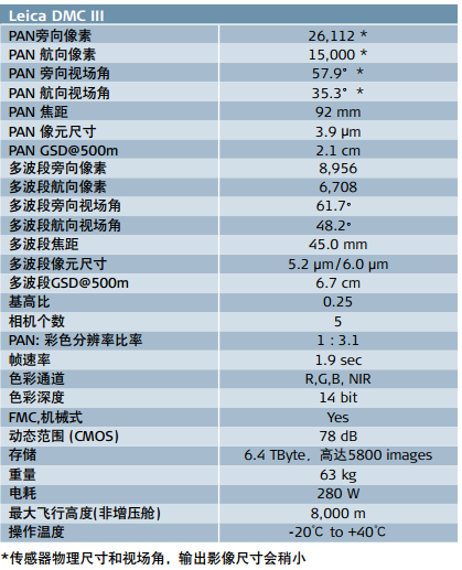 | 最大單片傳感器-幅寬高達(dá)26,112*像素 基于針對航空應(yīng)用而專門打造的全新CMOS傳感器, Leica DMCIII航空相機(jī)提供世界上單片傳感器能夠覆蓋的最大幅寬:簡單而直接,旁向26112*像素。這比當(dāng)前市面上的其他相機(jī)至少提高25%。而且,得益于它革命性的像移補(bǔ)償設(shè)計, Leica DMCIII將為您呈現(xiàn)單片傳感器前所未有的影像質(zhì)量和無可比擬的幾何精度。 隨著HxMAP的發(fā)布,徠卡測量系統(tǒng)為所有傳感器提供了最富創(chuàng)新性和直觀性的數(shù)據(jù)處理環(huán)境,大大提高了處理的速度和效率。 ![]() | 參數(shù)表![]() |