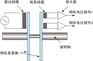 上圖所示,旋轉軸上的相位差基板的兩端設置有驅動線圈與檢測線圈,驅動線圈產(chǎn)生的磁場信號通過相位差基板,由檢測線圈產(chǎn)生出相應磁場的電壓信號。旋轉軸上加有扭矩時,旋轉軸將發(fā)生一定的扭曲,根據(jù)扭曲角的變化,2個檢測線圈的磁場間會產(chǎn)生相應的磁場相位差,將2個檢測線圈的磁場的電壓信號進行放大,送至TS-2800,根據(jù)磁場相位差信號計算出扭矩值。