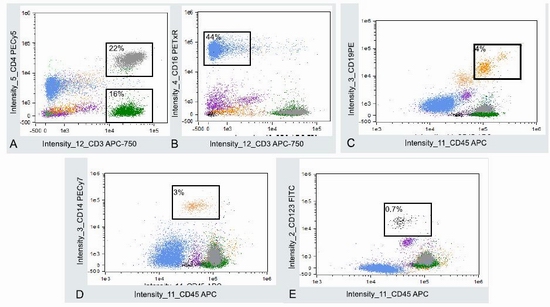免疫分型通常用來(lái)鑒別血細(xì)胞亞群。FlowSight最多能夠同時(shí)檢測(cè)10色熒光,最大程度地滿(mǎn)足研究者的實(shí)驗(yàn)需求。在這個(gè)例子中,研究人員用抗CD45, CD14, CD16, CD19, CD3, CD4和 CD123的抗體以及DAPI染料對(duì)細(xì)胞進(jìn)行標(biāo)記。通過(guò)一系列設(shè)門(mén)分析,他們鑒別了以下細(xì)胞類(lèi)群: (A) CD3+ T細(xì)胞, CD4+ 輔助T細(xì)胞; (B) CD16+ 粒細(xì)胞; (C) CD19+ B 細(xì)胞; (D) CD14+ 單核細(xì)胞; (E) CD123+ pDC/嗜堿性粒細(xì)胞.