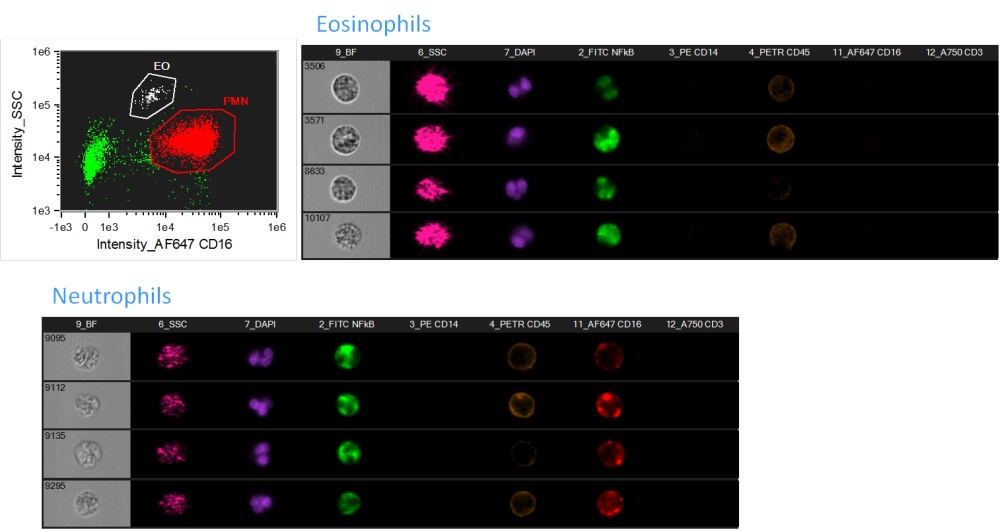NF-κβ作為一種廣泛存在的轉(zhuǎn)錄因子,被激活由胞漿轉(zhuǎn)入胞核,從而參與炎癥反應(yīng)、免疫反應(yīng)、細(xì)胞凋亡、腫瘤發(fā)生等??梢詫⒓?xì)胞核和NF-κβ分別用DAPI和FITC染色,F(xiàn)lowSight可觀察每個(gè)細(xì)胞是否發(fā)生 NF-κβ核轉(zhuǎn)位,并量化分析NFkB核轉(zhuǎn)位程度以及發(fā)生核轉(zhuǎn)位細(xì)胞的比例。