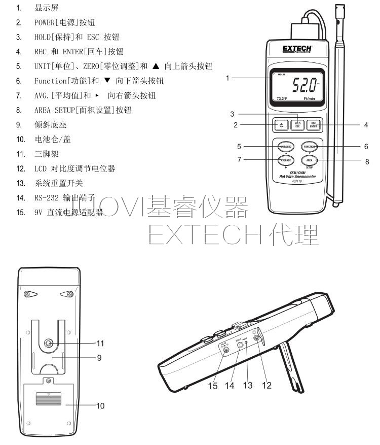 407119溫差式風(fēng)速計(jì)。407119溫差式風(fēng)速計(jì)可測(cè)量風(fēng)速、空氣量和空氣溫度。它使用伸縮式探針天線,能夠很方便地探入格柵和擴(kuò)散器。小心使用該儀表將使您常年享受其可靠服務(wù)。407119 A 型風(fēng)速計(jì)具有下列功能。