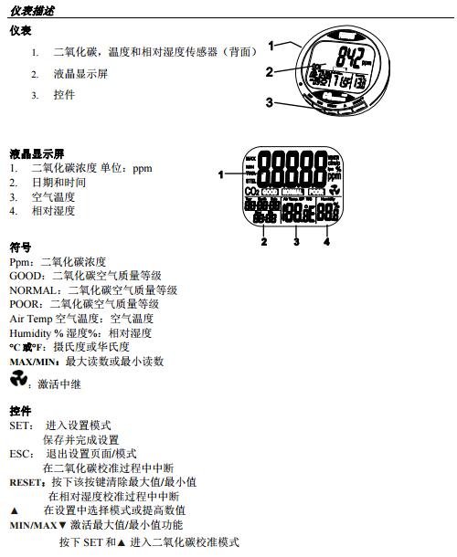 在正常模式中,按下最小值/最大值按鈕查看二氧化碳,溫度和濕度的最大值和最小值。按下最小值/最大值按鈕可依次查看最小值,最大值,然后返回到正常模式。按下重置按鈕超過 1 秒鐘,可清除內(nèi)存中的最小值和最大值。