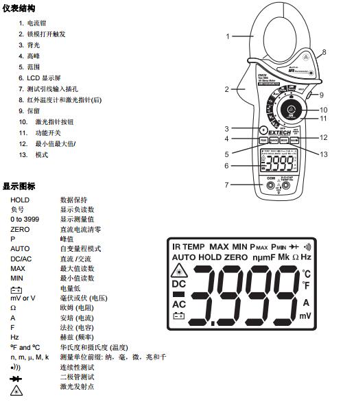 EX810 鉗表此計可測量交流/直流電壓、交流電流、電阻、電容、頻率、二級管測試、連續(xù)性、以及非接觸式紅外溫度。 正確的使用和照顧這個表將提供多年可靠的服務(wù)。