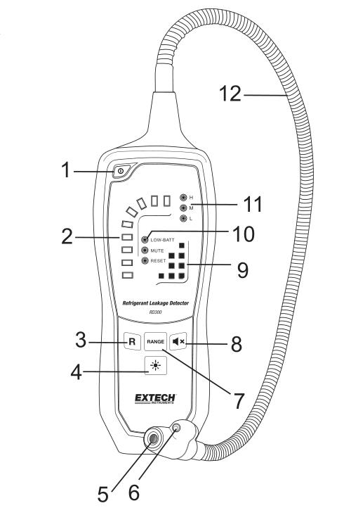 3.靈敏度范圍按鈕: 按靈敏度范圍按鈕改變靈敏度等級(jí)。的根據(jù)用戶的選擇, 高、中、低 led 指示燈將亮起。探測(cè)器將在 warm‐up 后自動(dòng)默認(rèn)為先前的靈敏度級(jí)別。