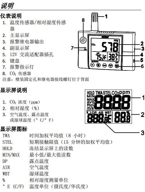 LCD 顯示屏可同時顯示 CO2 濃度、相對濕度和溫度(空氣溫度、露點(diǎn)溫度或濕球溫度)