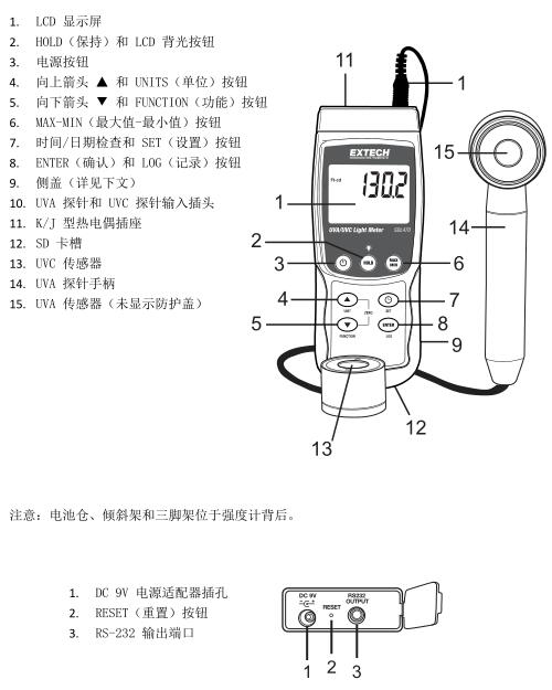 包含的配件 使用手冊、UVA 光強傳感器、UVC 光強傳感器、硬殼便攜包、AC 與 DC 9V 電源適配器、電池與用戶指南