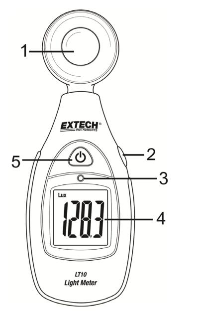 2. MAX‐LUX/fc 功能按鈕: 按下按鈕隨時查看讀取的最大值 (最大)。瞬間按下按鈕再次釋放最大顯示并返回到正常操作模式。按住此按鈕至少2秒鐘在盧森堡和 fc (足燭) 的度量單位之間切換。注意 1fc = 10.76 勒克斯。