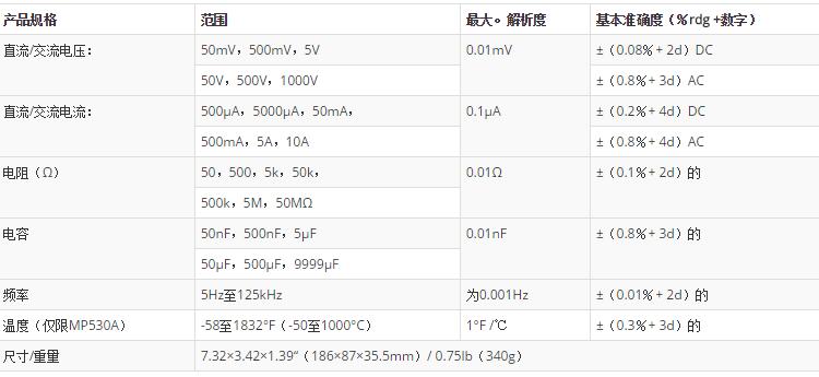 MP530A是一個(gè)5000計(jì)數(shù),True RMS自動(dòng)測距萬用表測量AC / DC電壓,AC / DC電流,電阻,溫度,電容和頻率,基本精度為0.08%。附加功能包括:二極管測試,連續(xù)性檢查,易于閱讀的背光顯示,自動(dòng)關(guān)機(jī),數(shù)據(jù)保持和低電阻自動(dòng)導(dǎo)線零點(diǎn)。UL列出,CAT IV-600 Volt等級(jí)。包括帶有內(nèi)置支架,測試導(dǎo)線,K型珠溫度探頭和9伏電池的保護(hù)套。