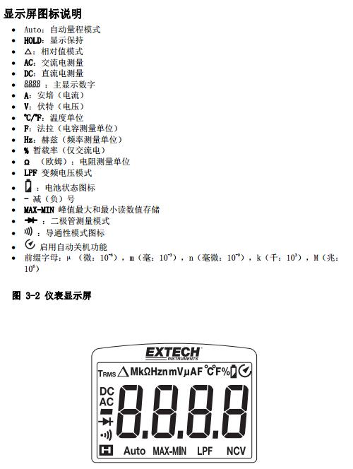 4. 儀表默認使用 Auto Range 模式(Auto 會顯示在 LCD 顯示屏上)。按下 R 按鈕進入手動量程模式。按下 R 按鈕可逐一跳過這些量程。按下并按住 R 按鈕返回 Auto Range 模式(Auto 會顯示在 LCD 顯示屏上)。