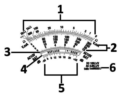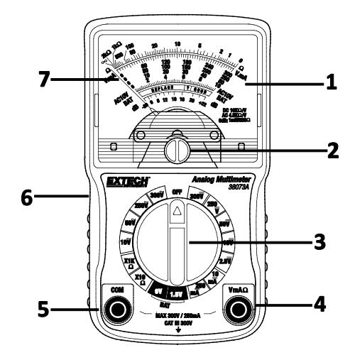 進(jìn)行任何測試前﹐利用一平頭螺絲刀扭動機(jī)械調(diào)零螺絲(2) 直到指針(7) 指向刻度最左邊之零。為獲得最高精確度﹐將儀表平放于非金屬表面上測試。