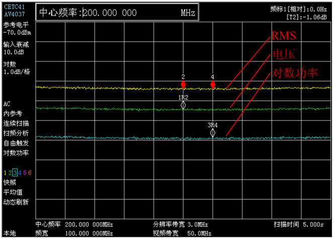 本產(chǎn)品提供多達(dá)6條顯示軌跡和12個(gè)頻標(biāo)。支持用戶同時(shí)激活多條軌跡、并選擇不同的視頻檢波方式對(duì)信號(hào)進(jìn)行同步測(cè)試。本產(chǎn)品的頻標(biāo)功能靈活,支持用戶在多條軌跡上同時(shí)激活多個(gè)頻標(biāo),并支持跨軌跡的頻標(biāo)互為參考,進(jìn)行相對(duì)參數(shù)測(cè)量。