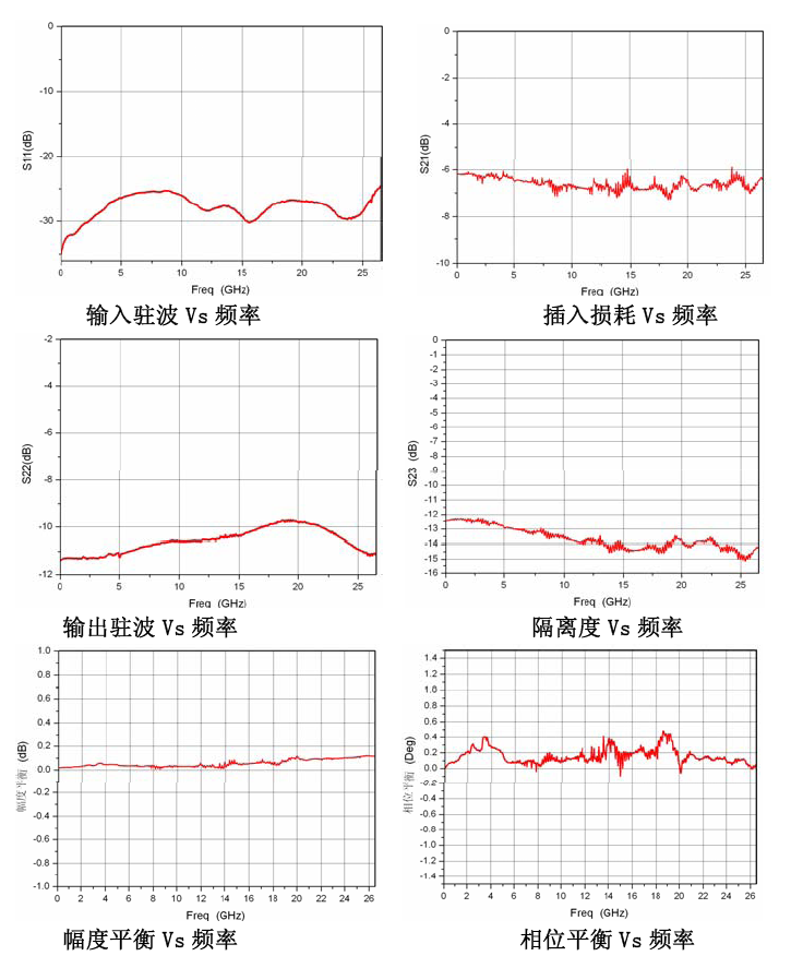 頻率范圍(GHz) | 隔離度 (dB Min) | 回波損耗 (Min) | 插入損耗 (dB Max) | 幅度平衡 (dB) | 相位平衡 (Deg) | 路數(shù) | 輸入功率 (W Max) | 接口形式 |