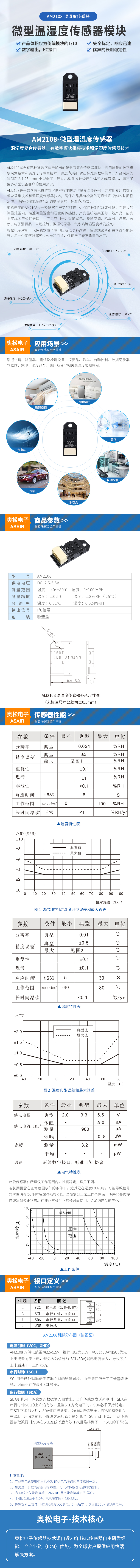 AM2108是一款含有已校準(zhǔn)數(shù)字信號輸出的溫濕度復(fù)合傳感器,并應(yīng)用專用的數(shù)字模塊采集技術(shù)和溫濕度傳感器技術(shù),確保產(chǎn)品具有極高的可靠性和卓越的長期穩(wěn)定性。傳感器輸出經(jīng)過標(biāo)定的數(shù)字信號,標(biāo)準(zhǔn)I2C格式。AM2108配有一個全新設(shè)計的ASIC專用芯片、一個經(jīng)過改進(jìn)的MEMS半導(dǎo)體電容式濕度傳感元件和一個標(biāo)準(zhǔn)的片上溫度傳感元件,其性能達(dá)到行業(yè)先進(jìn)水平。經(jīng)過改進(jìn)的新一代溫濕度傳感器,使其在惡劣環(huán)境下的性能更穩(wěn)定,并且在較大的測量范圍內(nèi)保持良好的精度。奧松電子對新一代傳感器做了寬電壓及低功耗改進(jìn),使終端設(shè)備都將獲得節(jié)能運(yùn)行,每一個傳感器都經(jīng)過精密的校準(zhǔn)和多次測試,保證產(chǎn)品的高質(zhì)量的出廠。本產(chǎn)品外觀精美、連接方便、適用領(lǐng)域廣。