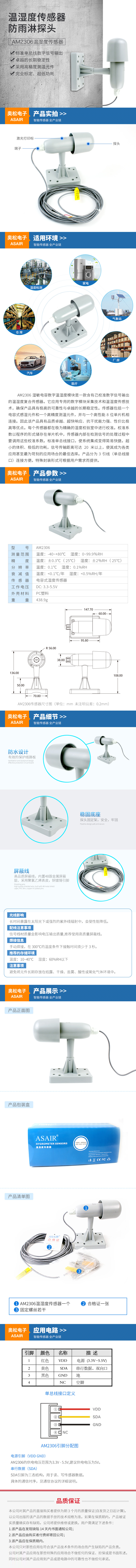 AM2306 濕敏電容數(shù)字溫濕度模塊是一款含有己校準(zhǔn)數(shù)字信號輸出的溫濕度復(fù)合傳感器。它應(yīng)用專用的數(shù)字模塊采集技術(shù)和溫濕度傳感技術(shù),確保產(chǎn)品具有極高的可靠性與卓越的長期穩(wěn)定性。傳感器包括一個電容式感濕元件和一個高精度測溫元件,并與一個高性能 8 位單片機(jī)相連接。因此該產(chǎn)品具有品質(zhì)卓越、超快響應(yīng)、抗干擾能力強(qiáng)、性價比極高等優(yōu)點(diǎn)。每個傳感器都在極為精確的濕度校驗(yàn)室中進(jìn)行校準(zhǔn)。校準(zhǔn)系數(shù)以程序的形式儲存在單片機(jī)中,傳感器內(nèi)部在檢測信號的處理過程中要調(diào)用這些校準(zhǔn)系數(shù)。標(biāo)準(zhǔn)單總線接口,使系統(tǒng)集成變得簡易快捷。超小的體積、極低的功耗,信號傳輸距離可達(dá) 20 米以上,使其成為各類應(yīng)用甚至最為苛刻的應(yīng)用場合的最佳選擇。產(chǎn)品分為 3 引線(單總線接口)連接方便。特殊封裝形式可根據(jù)用戶需求而提供。