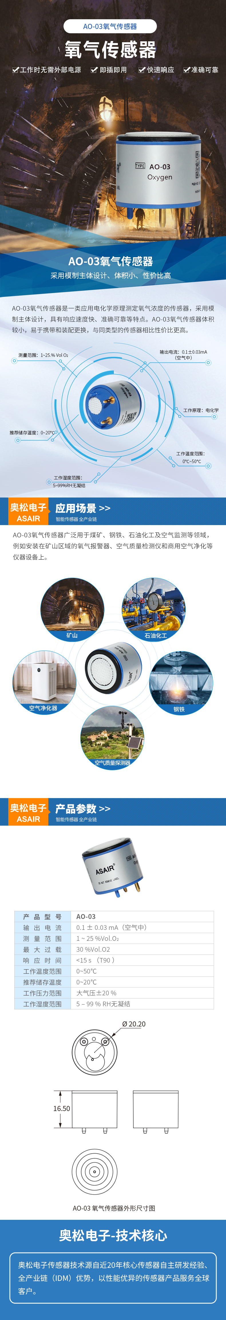 AO-03氧氣傳感器廣泛用于煤礦、鋼鐵、石油化工及空氣監(jiān)測(cè)等領(lǐng)域,例如安裝在礦山區(qū)域的氧氣報(bào)警器、空氣質(zhì)量檢測(cè)儀和商用空氣凈化等儀器設(shè)備上。