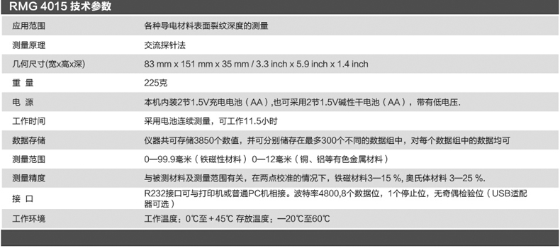 德國(guó)KDRMG4015裂紋測(cè)深儀的技術(shù)細(xì)節(jié)與其它傳統(tǒng)儀器相似,通過工件的電流值為500mA。但是對(duì)比目前那些探頭一旦接觸就產(chǎn)生持續(xù)電流的儀器,德國(guó)KDRMG4015裂紋測(cè)深儀在一次檢測(cè)中只產(chǎn)生持續(xù)幾毫秒的電流脈沖。重復(fù)速率將近一秒一次檢測(cè)。顯示隨之更新。這樣,儀器使用電池時(shí)可以在探頭連續(xù)接觸情況下工作12小時(shí)。如果使用充電電池,儀器可不必打開,電池能通過外置的充電器充電。薄膜鍵盤是由按鍵組成,可以直接進(jìn)入儀器的基本測(cè)量功能。德國(guó)KDRMG4015裂紋測(cè)深儀許多參數(shù)可以通過菜單鍵顯示。參數(shù)用清晰的語言顯示(英語或德語)。操作和傳統(tǒng)的壁厚、涂層厚度測(cè)量?jī)x一樣簡(jiǎn)單容易。德國(guó)KDRMG4015裂紋測(cè)深儀儀器的數(shù)據(jù)記錄器可以處理超過3850個(gè)測(cè)量結(jié)果,可以存儲(chǔ)超過300個(gè)獨(dú)立數(shù)據(jù)。內(nèi)置的實(shí)時(shí)時(shí)鐘自動(dòng)記錄測(cè)量數(shù)據(jù)和測(cè)量時(shí)間。測(cè)量可通過系列界面打印出。相同的界面也允許與PC通信,通過WINDOWS操作系統(tǒng)的應(yīng)用程序程序“STATUS WINDOWS”。它不僅有傳輸功能,也能處理和圖表顯示測(cè)量值。