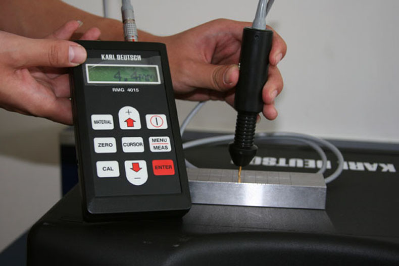 德國(guó)KDRMG4015裂紋測(cè)深儀提供一個(gè)帶有從0mm到10mm深度人工裂紋的校準(zhǔn)試塊,這樣用戶可在測(cè)量期間校準(zhǔn)儀器和探頭。探針的磨損或超過范圍的溫度導(dǎo)致的偏差可通過再校準(zhǔn)補(bǔ)償。正確的值可以儲(chǔ)存在探頭中。裂紋深度內(nèi)的測(cè)量電壓轉(zhuǎn)換是由RMG 4015的微處理器控制的。出廠設(shè)置的校準(zhǔn)表正是出于此目的存儲(chǔ)在儀器中的。測(cè)量之前,將探頭放于工件無裂紋處,測(cè)量電壓與校準(zhǔn)表中的存儲(chǔ)值相比較。微處理器根據(jù)材料的特殊性來確定以后測(cè)量裂紋的確切深度。測(cè)量由微處理器監(jiān)控。由于不充分探針的接觸而導(dǎo)致的誤操作、錯(cuò)誤的接觸或探頭的顫動(dòng)是可以避免的。這樣,錯(cuò)誤的結(jié)果幾乎不可能發(fā)生。可以獲得佳的測(cè)量再線性性(+/-0.1mm100mm裂紋深度)。即使是低標(biāo)號(hào)鋼或無滲透(如奧氏體鋼)或高導(dǎo)電的非鐵性材料(如鋁或銅),都能獲得足夠的精度。