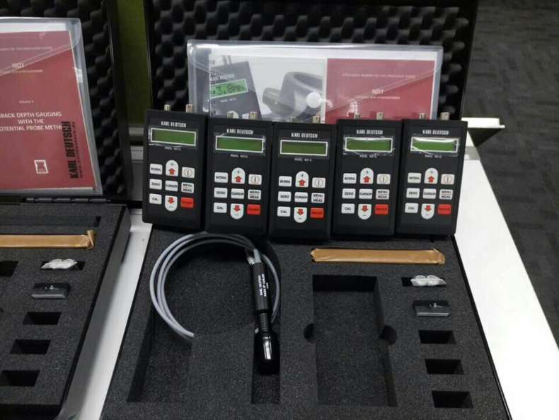 新型的德國(guó)KDRMG4015裂紋測(cè)深儀可測(cè)量鐵質(zhì)材料、奧氏體鋼工件,同時(shí)可用于銅、黃銅、鋁和其它非鐵質(zhì)材料。它按照電位探頭原理操作:一個(gè)帶有四個(gè)彈簧式、鍍金觸針的探頭橫跨于工件裂紋處檢測(cè)。持續(xù)的交流電經(jīng)兩個(gè)探針進(jìn)入工件;另外兩個(gè)探頭測(cè)量電流通過裂紋底部后電壓的下降值。儀器的交流電利用趨膚效應(yīng),即電流在導(dǎo)體表面流動(dòng),因此也就是沿著裂紋的輪廓。操作和測(cè)量值信息是由測(cè)量?jī)x的微處理器控制,完全避免了由于錯(cuò)誤的、未完全接觸而導(dǎo)致的錯(cuò)誤測(cè)量和誤操作現(xiàn)象出現(xiàn)。德國(guó)KDRMG4015裂紋測(cè)深儀檢測(cè)報(bào)告可通過RS232串口線從小型打印機(jī)(可按附件提供)打印,也可使儀器同PC通信(通過STATWIN 2002軟件)。