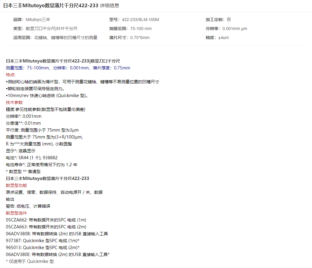 本網(wǎng)頁所展示的有關(guān)【三豐 422-233數(shù)顯薄片千分尺】的信息/圖片/參數(shù)等由的會員【日本三豐mitutoyo-深圳柏萊科技有限公司 】提供,由柏萊儀器網(wǎng)-專業(yè)銷售儀器儀表服務(wù)商-深圳柏萊科技有限公司會員【日本三豐mitutoyo-深圳柏萊科技有限公司 】自行對信息/圖片/參數(shù)等的真實性、準確性和合法性負責(zé),本平臺(本網(wǎng)站)僅提供展示服務(wù),請謹慎交易,因交易而產(chǎn)生的法律關(guān)系及法律糾紛由您自行協(xié)商解決,本平臺(本網(wǎng)站)對此不承擔任何責(zé)任。您在本網(wǎng)頁可以瀏覽【三豐 422-233數(shù)顯薄片千分尺】有關(guān)的信息/圖片/價格等及提供 【三豐 422-233數(shù)顯薄片千分尺】的商家公司簡介、聯(lián)系方式等信息。