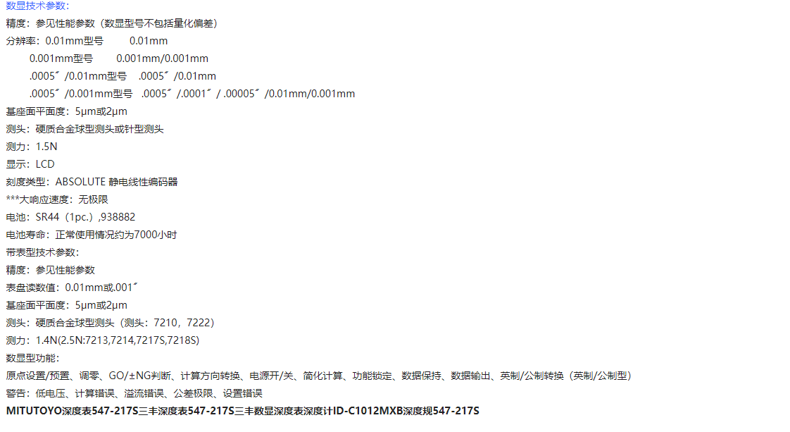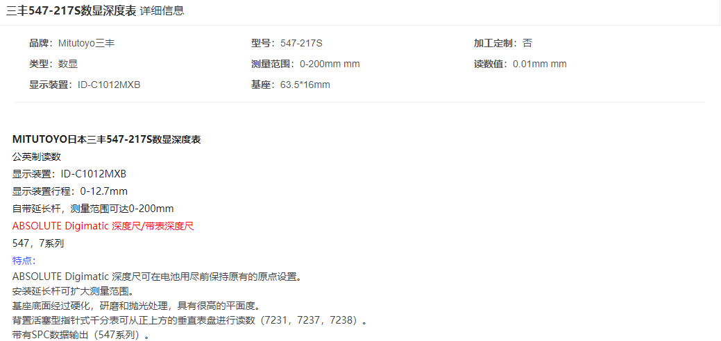 本網(wǎng)頁所展示的有關(guān)【三豐 547-217S數(shù)顯深度表】的信息/圖片/參數(shù)等由的會(huì)員【日本三豐mitutoyo-深圳柏萊科技有限公司 】提供,由柏萊儀器網(wǎng)-專業(yè)銷售儀器儀表服務(wù)商-深圳柏萊科技有限公司會(huì)員【日本三豐mitutoyo-深圳柏萊科技有限公司 】自行對信息/圖片/參數(shù)等的真實(shí)性、準(zhǔn)確性和合法性負(fù)責(zé),本平臺(tái)(本網(wǎng)站)僅提供展示服務(wù),請謹(jǐn)慎交易,因交易而產(chǎn)生的法律關(guān)系及法律糾紛由您自行協(xié)商解決,本平臺(tái)(本網(wǎng)站)對此不承擔(dān)任何責(zé)任。您在本網(wǎng)頁可以瀏覽【三豐 547-217S數(shù)顯深度表】有關(guān)的信息/圖片/價(jià)格等及提供 【三豐 547-217S數(shù)顯深度表】的商家公司簡介、聯(lián)系方式等信息。