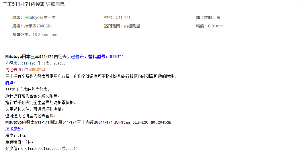 本網(wǎng)頁所展示的有關(guān)【三豐 511-171內(nèi)徑表】的信息/圖片/參數(shù)等由的會(huì)員【日本三豐mitutoyo-深圳柏萊科技有限公司 】提供,由柏萊儀器網(wǎng)-專業(yè)銷售儀器儀表服務(wù)商-深圳柏萊科技有限公司會(huì)員【日本三豐mitutoyo-深圳柏萊科技有限公司 】自行對信息/圖片/參數(shù)等的真實(shí)性、準(zhǔn)確性和合法性負(fù)責(zé),本平臺(tái)(本網(wǎng)站)僅提供展示服務(wù),請謹(jǐn)慎交易,因交易而產(chǎn)生的法律關(guān)系及法律糾紛由您自行協(xié)商解決,本平臺(tái)(本網(wǎng)站)對此不承擔(dān)任何責(zé)任。您在本網(wǎng)頁可以瀏覽【三豐 511-171內(nèi)徑表】有關(guān)的信息/圖片/價(jià)格等及提供 【三豐 511-171內(nèi)徑表】的商家公司簡介、聯(lián)系方式等信息。