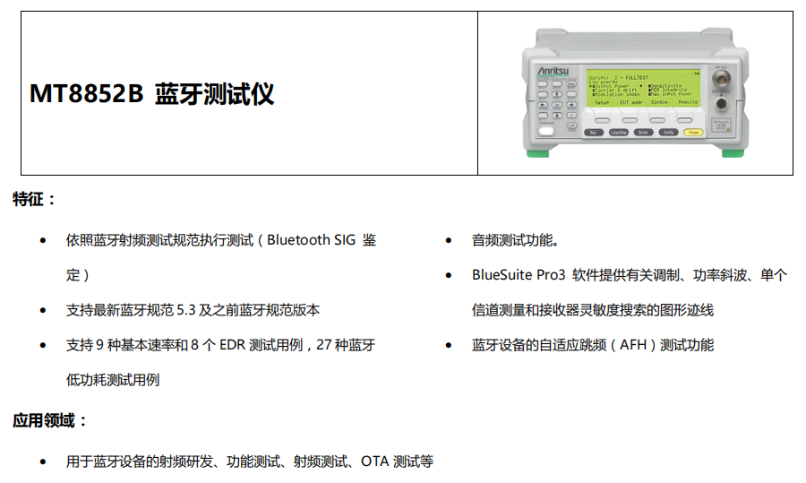本網(wǎng)頁所展示的有關(guān)【MT8852B藍牙測試儀】的信息/圖片/參數(shù)等由的會員【日本安立-深圳柏萊科技有限公司 】提供,由柏萊儀器網(wǎng)-專業(yè)銷售儀器儀表服務(wù)商-深圳柏萊科技有限公司會員【日本安立-深圳柏萊科技有限公司 】自行對信息/圖片/參數(shù)等的真實性、準確性和合法性負責,本平臺(本網(wǎng)站)僅提供展示服務(wù),請謹慎交易,因交易而產(chǎn)生的法律關(guān)系及法律糾紛由您自行協(xié)商解決,本平臺(本網(wǎng)站)對此不承擔任何責任。您在本網(wǎng)頁可以瀏覽【MT8852B藍牙測試儀】有關(guān)的信息/圖片/價格等及提供 【MT8852B藍牙測試儀】的商家公司簡介、聯(lián)系方式等信息。