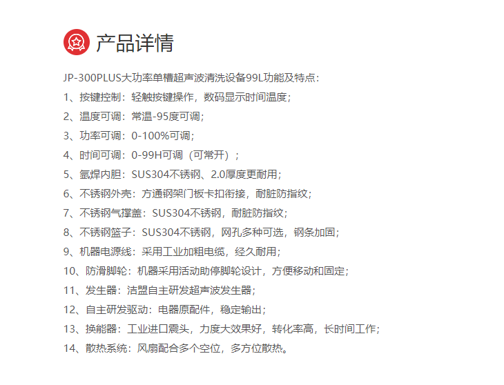 本網(wǎng)頁(yè)所展示的有關(guān)【大功率單槽超聲波清洗JP-300PLUS】的信息/圖片/參數(shù)等由的會(huì)員【潔盟-深圳柏萊科技有限公司 】提供,由柏萊儀器網(wǎng)-專業(yè)銷售儀器儀表服務(wù)商-深圳柏萊科技有限公司會(huì)員【潔盟-深圳柏萊科技有限公司 】自行對(duì)信息/圖片/參數(shù)等的真實(shí)性、準(zhǔn)確性和合法性負(fù)責(zé),本平臺(tái)(本網(wǎng)站)僅提供展示服務(wù),請(qǐng)謹(jǐn)慎交易,因交易而產(chǎn)生的法律關(guān)系及法律糾紛由您自行協(xié)商解決,本平臺(tái)(本網(wǎng)站)對(duì)此不承擔(dān)任何責(zé)任。您在本網(wǎng)頁(yè)可以瀏覽【大功率單槽超聲波清洗JP-300PLUS】有關(guān)的信息/圖片/價(jià)格等及提供 【大功率單槽超聲波清洗JP-300PLUS】的商家公司簡(jiǎn)介、聯(lián)系方式等信息。